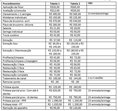 Consultório odontológico, conta com dentistas que atendem de 2ª a 6ª feira, com hora marcada, pelo fone / whats 3322-1828. Veja tabela abaixo